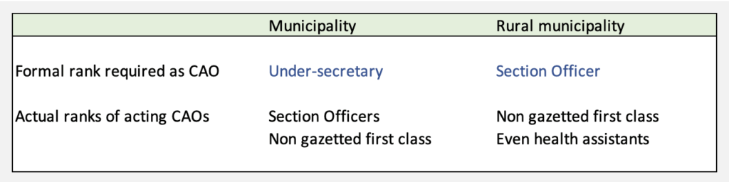 Thus, one metropolitan and nine sub-metropolitan cities still lack “permanent CAOs” and continue with “acting CAOs”. The reason is a familiar one, as explained by spokesperson, Parajuli, namely an inability to fill all positions with staffers of “joint secretary” rank, as required by law, as joint secretaries “generally prefer not to be posted outside Kathmandu”. Thus, “under-secretaries” have been deployed as “acting” CAOs instead, notwithstanding the otherwise principled decision applied to CAOs at the municipal and rural municipal level.