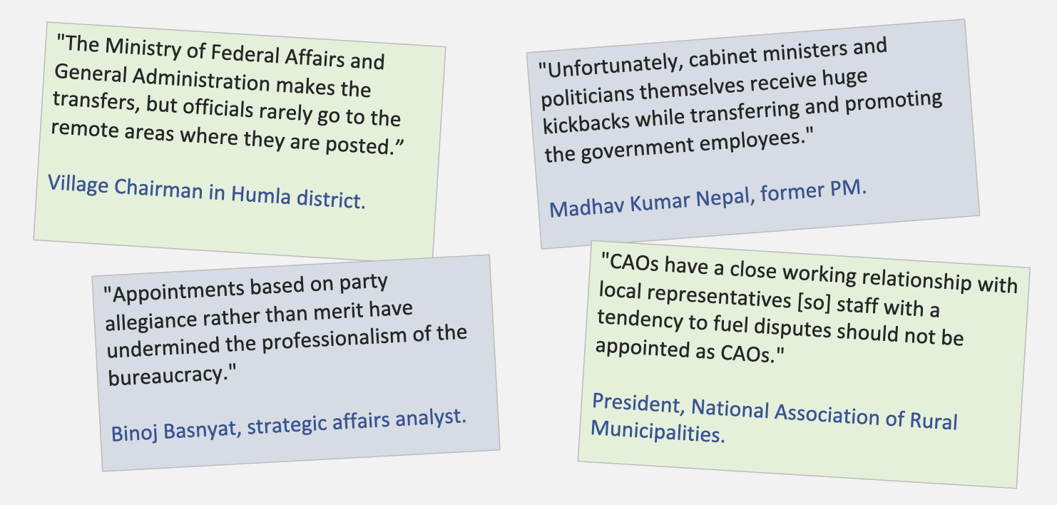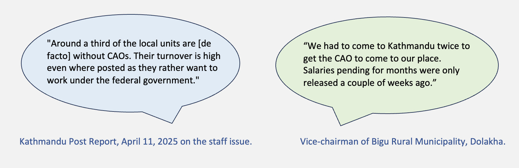 This lurking doubt arises from the whole context of “unstable” and “unprofessional” local administration in Nepal. Since the first local election under the federal system in 2017, the staffing of CAO positions has been “troubled waters” indeed, not least due to conflicts between elected local representatives and appointed CAOs. As some CAOs turned out to informally serve a “party” or “faction” or refused to agree to local requests for other reasons, some conflicts have reached boiling point. Many conflicts have also started as CAOs never showed up or were frequently absent, causing frustrating obstacles and delays.