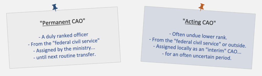 Yet, is this indeed a “landmark decision” likely to achieve the stated objectives? Well, the termination of “acting CAO” positions is an unprecedented move. It breaks with a long-time practice of allowing local representatives to have some informal influence on CAO postings. Some locals have been able to block undesired CAOs and to have preferred staffers posted instead, others to nominate local staffers as “acting CAOs” and thus to have de facto influence. “Ministerial appointment”, in contrast, is not new, as the ministry always had formal and exclusive authority to post, transfer, and promote CAOs.